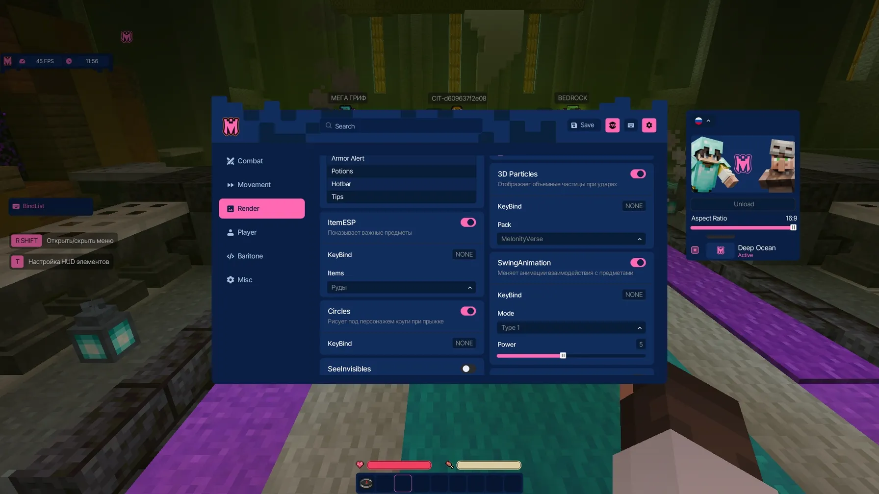 Melonity – это всестороннее решение для Minecraft с более чем 60 функциями за 500₽ в месяц. Чит включает продвинутые боевые модули (KillAura, AutoCrystal, TriggerBot), системы выживания (AutoTotem, AutoGapple), визуальные улучшения (ESP, ShaderESP, BlockESP) и утилиты (Nuker, AutoAuth, FreeCam). Оптимизирован для популярных серверов с защитой от обнаружения.