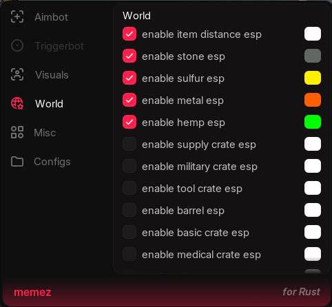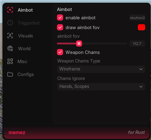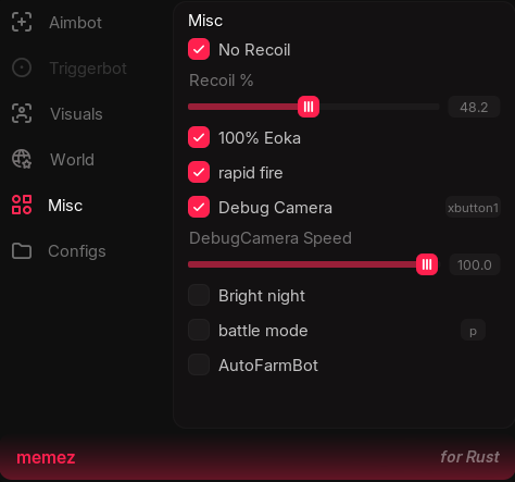 Memez External — это революционный внешний чит для Rust, работающий без инъекции в игровой процесс, что делает его практически необнаружимым. С ним вы получаете мощный ESP с интеллектуальной фильтрацией (игроки, постройки, ресурсы), умный аим-ассистент с естественной траекторией и многоуровневую защиту от EAC. Благодаря уникальной технологии драйверной маскировки, Memez External обеспечивает абсолютную безопасность вашего аккаунта, сохраняя при этом максимальную производительность даже на слабых ПК. Этот чит идеально подходит для осторожных игроков, стримеров и кланов, ценящих стабильность и незаметность. С интуитивным интерфейсом и автоматическими обновлениями вы сможете начать доминировать уже через 2 минуты после установки. Memez External — это не просто чит, а ваш технологический перевес в жестоком мире Rust.