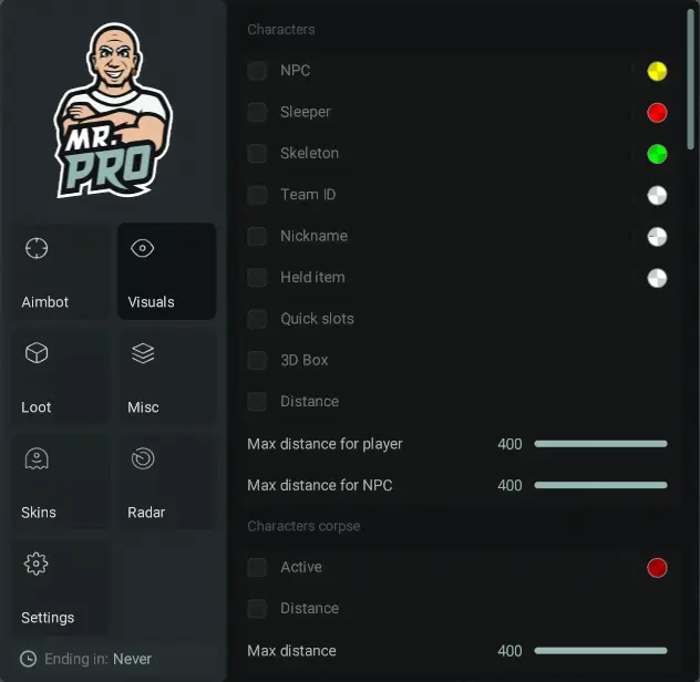 Max distance (1-400) — Выбор расстояния для отображения трупов персонажей