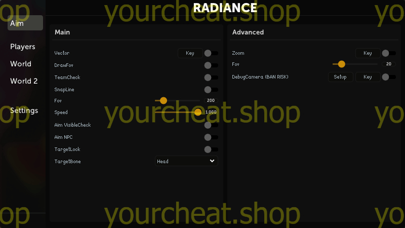 Aim (Дополнительное): Зум, Поле зрения при зуме (меняет угол обзора при приближении), Отладочная камера (высокий риск бана за её использование), Стандартная скорость прицеливания, Замедление прицеливания, Ускорение при беге.
