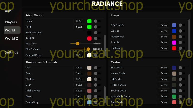World (Основное): Отключить все ESP (Боевой режим), Индикатор событий на карте, Рюкзаки игроков, Трупы игроков, Растения конопли, Еда на карте, Маркеры пуль (показывает траекторию пуль), ESP для рейдов, Максимальное время отображения рейдов, Максимальная дистанция рейдов, Выпавшие предметы.