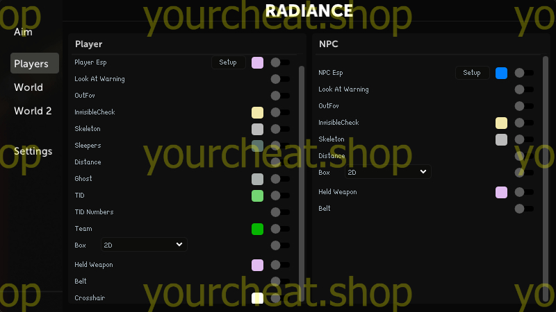 Player ESP (NPC): ESP для NPC, Предупреждение о возможной видимости NPC, Враги за пределами поля зрения, Проверка на невидимость NPC, Отображение скелета NPC, Дистанция до NPC, Коробка вокруг NPC (2D/угловая), Отображение оружия NPC, Пояс NPC.