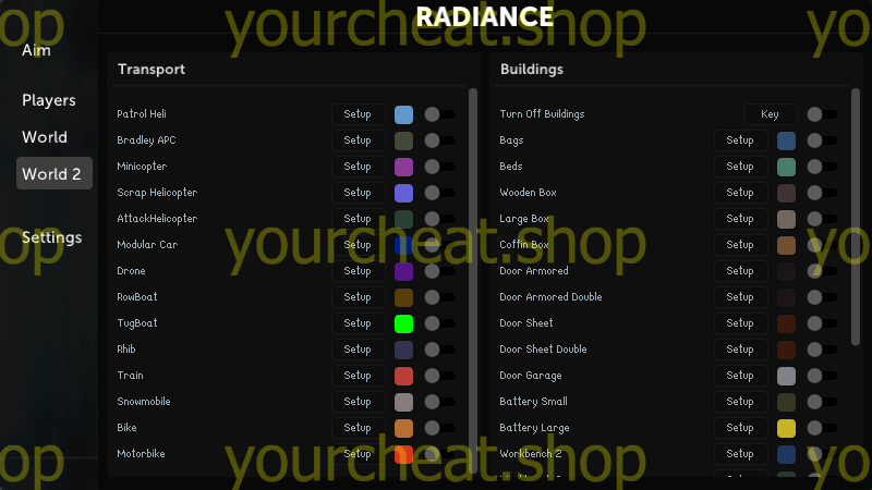 Radiance — ваш надёжный помощник в игре Rust! Этот приватный чит предоставит все необходимые инструменты для успешной игры: от мощного аимбота и ESP до флайхака и других функций.